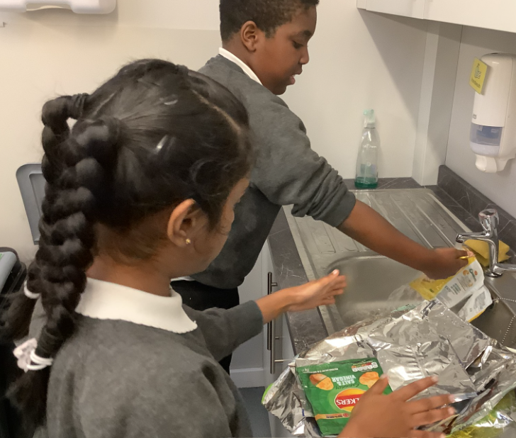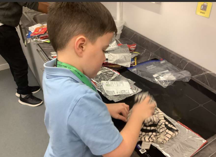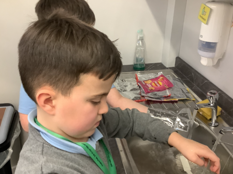 The crisp packets are washed, dried and prepared by the Junior leadership team so they can be melted together to create strong, waterproof, heat-reflective blankets. These blankets help keep people warm during cold weather and show how everyday materials can be reused to support others.